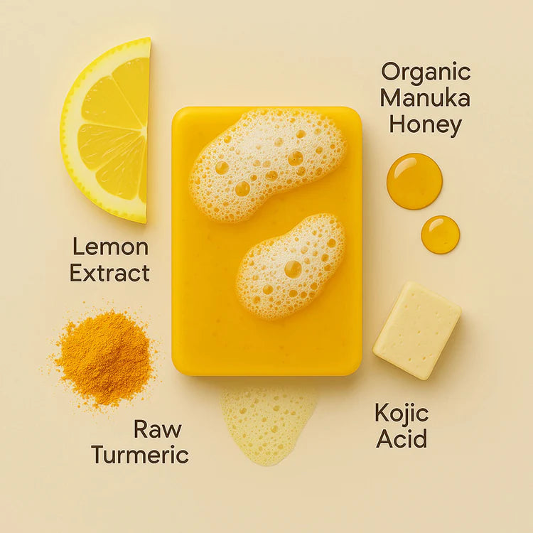 Organic Turmeric, Kojic Acid, Coconut Oil, Shea Butter, Vitamin E, Glycerin